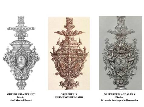 Se inspira en los bordados y orfebrería del palio. Son de cuatro caras, teniendo cada una una cartela diferente: la cruz de San Andrés, el anagrama del Ave María, el lema «Regla de Vida» y el emblema de las Jornadas Mundiales de la Juventud de 2011. Aparecen también grifos y jarras de azucenas que evocan a las que figuran en los paños de las bambalinas y el manto.