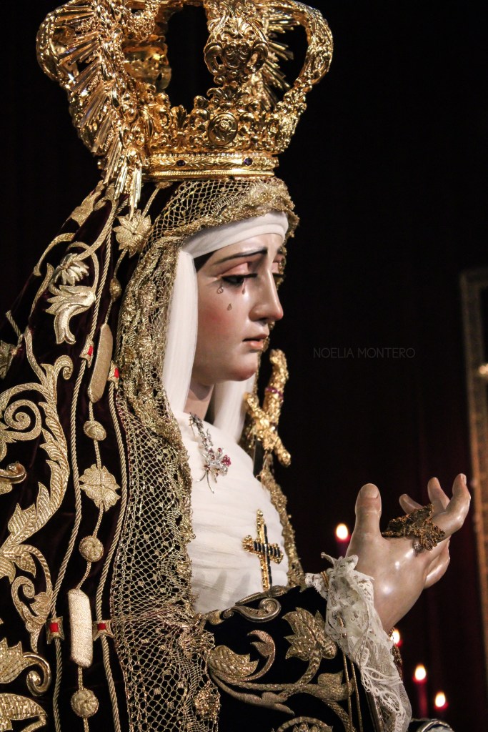 La Virgen de la Victoria de la Hermandad de las Cigarreras cuenta con una nueva saya donada y confeccionada por los bordadores Cristóbal Leal y Ricardo Canela en tisú de oro y sedas de colores sobre terciopelo granate.