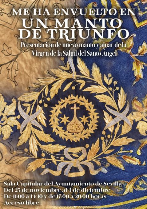 Del 25 de noviembre al 3 de diciembre, de 11h a 13.30h y de 17h a 20h será expuesto en la Sala Capitular del Ayuntamiento de Sevilla el nuevo manto de besamanos de María Santísima de la Salud del Grupo de Fieles de los Desamparados del Santo Ángel.