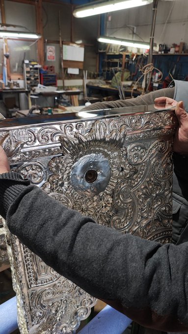 La Hermandad del Cachorro ha hecho públicas algunas imágenes sobre cómo avanza la restauración de los respiraderos del paso de palio de la Virgen del Patrocinio, de manos de Orfebrería Villarreal. Esta pieza fue labrada por Fernando Marmolejo en 1973.