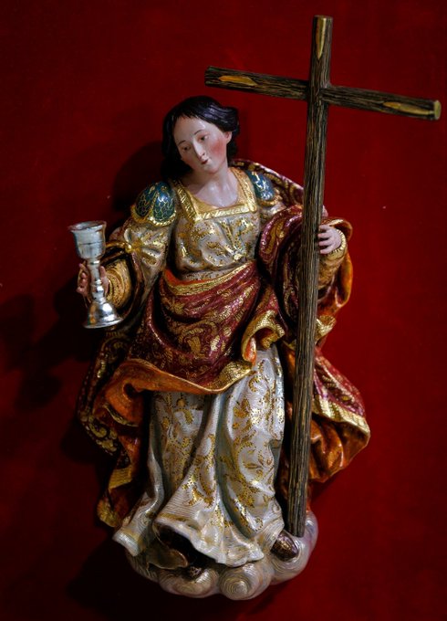 La virtud teologal de la Fe se representa portando en su mano derecha un cáliz, realizado en madera torneada y dorada en oro blanco, y sujetando en su mano izquierda la Santa Cruz, también realizada en madera de cedro dorada con oro de 24 quilates y posteriormente estofada al temple de huevo.