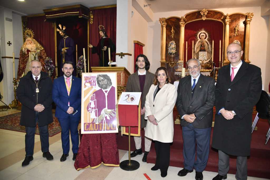 En la noche del pasado viernes 10 de febrero la Hermandad del Juncal dio el pistoletazo de salida a los actos y cultos del 50 aniversario de la llegada a la Parroquia del Juncal de la imagen de Nuestro Padre Jesús Cautivo en Su Soledad, con la presentación del cartel obra del taller Daroal y el logo conmemorativo obra de Bruno Halcón Gómez.
