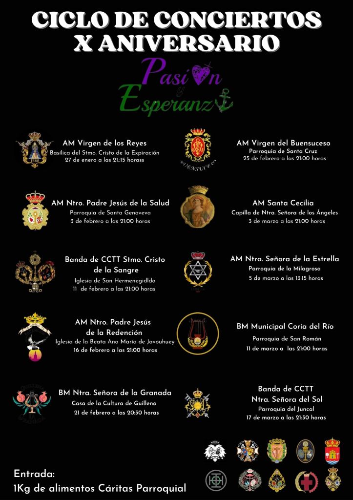 Tras el éxito cosechado el pasado 27 de enero en la Basílica del Santísimo Cristo de la Expiración de la Hermandad del Cachorro, junto a la Agrupación Musical Virgen de los Reyes, y del 3 de febrero en la parroquia de Santa Genoveva junto a Agrupación Musical Nuestro Padre Jesús de la Salud y la saetera Pilar Sánchez, le siguieron los conciertos de la Banda de Cornetas y Tambores del Santísimo Cristo de la Sangre en la iglesia de San Hermenegildo el 11 de febrero y de la Agrupación Musical Nuestro Padre Jesús de la Redención en la Hermandad del Divino Perdón el 16 de febrero. Además, el martes 21 de febrero se realizó un programa especial desde la Casa de la Cultura de Guillena con concierto de la Banda de Música Nuestra Señora de la Granada.