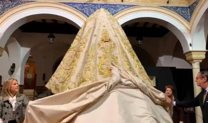La Hermandad de San Gonzalo ha presentado en el Círculo Mercantil, antes del inicio de la exposición ‘Estrenos y Restauraciones de la Semana Santa 2023’, el nuevo manto bordado de salida de la Virgen de la Salud, el cual será el gran estreno del próximo Lunes Santo y de la Semana Mayor.