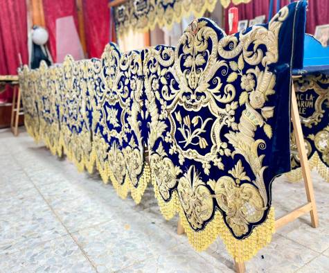 Se ha trabajo limpiando integralmente todos los bordados, exteriores e interiores, reemplazando la flequería de bellotas y los cordones antiguos. Los devotos han podido adquirir los antiguos flecos. También se han realizado nuevos cíngulos para los varales y bambalinas frontal y trasera con el mismo diseño. Hay que tener en cuenta también la sustitución de la carpintería de la crestería de todas las bambalinas y se ha realizado una nueva mejorando la estabilidad.