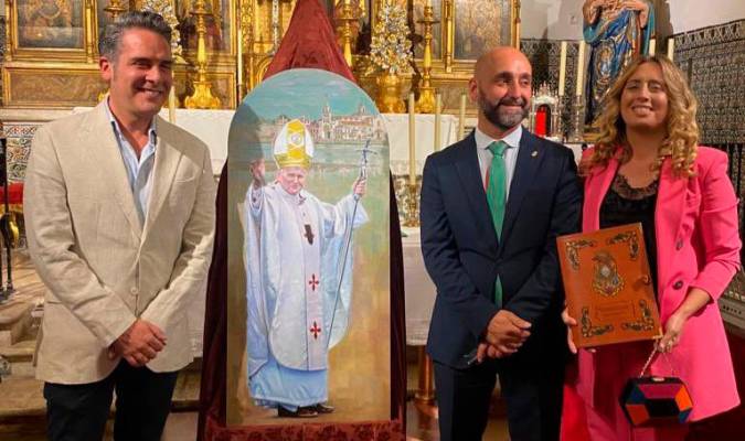 La obra ha sido realizada al óleo y en ella podemos apreciar al Papa San Juan Pablo II sobre las marismas con el Santuario de la Virgen del Rocío al fondo. El artista ha explicado que el motivo de colocar al Santo Padre como figura central del cartel es debido a que este año se conmemora el trigésimo aniversario de la visita de Su Santidad a la aldea del Rocío.