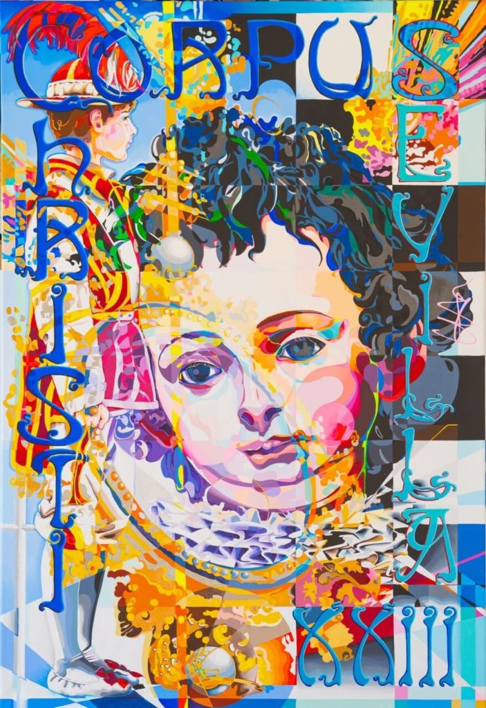 La obra lleva por título ‘En cuerpo y alma’ y Geub ha utilizado la técnica de acrílico y óleo sobre lienzo para ejecutar un cartel que tiene como protagonistas tres elementos que la autora considera muy representativos del Corpus: la imagen del Niño Jesús del Sagrario de Martínez Montañés, un niño seise y la Custodia de Arfe. Y todo ello sobre un fondo colorido que Geub identifica con lo que la celebración de esta fiesta significa en Sevilla y enmarcado por la leyenda ‘Corpus Christi Sevilla XXIII’ “a modo de sopa de letras”, según la autora del cartel.