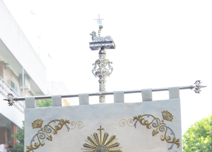 La Hermandad del Cerro del Águila ha presentado la restauración del remate de su Estandarte Sacramental, el Cordero Pascual que elaborase la Viuda de Villarreal. Símbolo del sacrificio de Cristo, figura con el lábaro de la Resurrección, recostado sobre el Libro de los Siete Sellos.