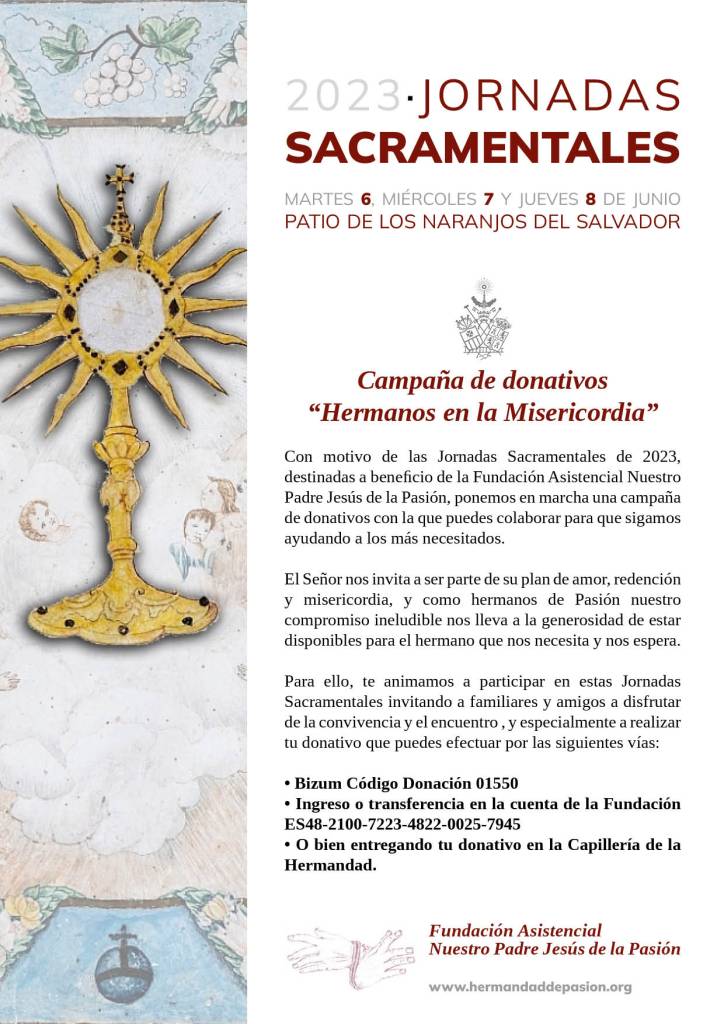 Las Jornadas Sacramentales se han convertido ya en un clásico de los días previos al Corpus Christi, celebrándose una velá en el patio de los naranjos de la Iglesia Colegial del Salvador a beneficio de la Fundación Asistencial Nuestro Padre Jesús de la Pasión. Durante los días 6, 7 y 8 se podrán disfrutar de un selecto ambigú amenizado por bandas y coros que acompañarán el evento.