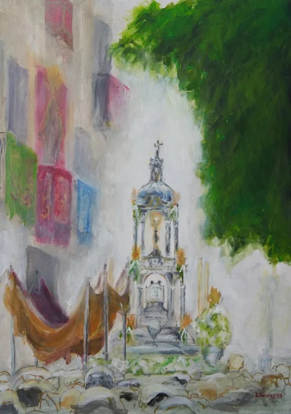 El cartel es obra del párroco de Santa Ana, Ildefonso Milla, y recrea la explosión de luz y color que esta conmemoración representa para los trianeros y sevillanos. El autor ha destacado «la presencia del Santísimo rodeada de balcones de Triana, de la luz y del humo del incienso que refuerza el color y el calor de junio y la popularidad de este acto devocional público entre todos los vecinos y vecinas que acompañan al Señor en la calle».