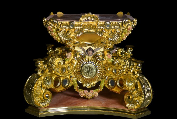 La siguiente fase consistirá en el dorado de los mecheros de la peana, completar las cartelas y grabar los soles restantes. La peana está dorada en oro fino de 23 3/4 kilates.