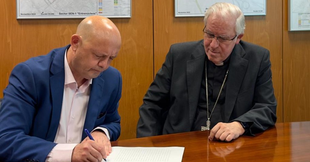 El Ayuntamiento de Dos Hermanas ha cedido a la Archidiócesis de Sevilla una parcela de 3.000 metros cuadrados para la construcción de una nueva parroquia en la zona de Entrenúcleos, una zona en plena expansión. La firma se efectuó el pasado 29 de junio entre el arzobispo de Sevilla, don José Ángel Saiz, y el alcalde nazareno, Francisco Rodríguez.