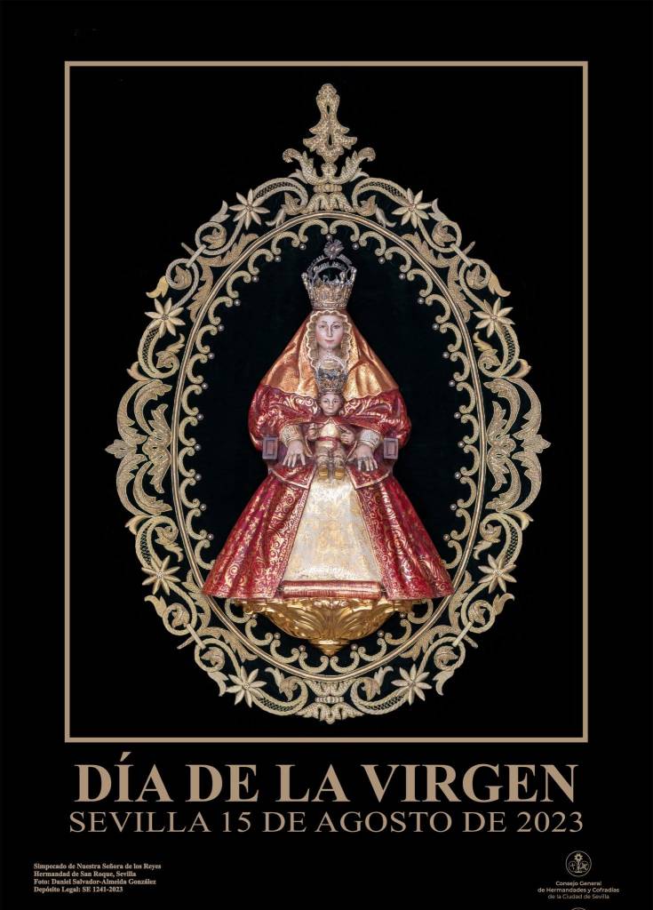 Este viernes se ha presentado en la sede del Consejo de Hermandades y Cofradías el cartel del Día de la Virgen, que por tercer año consecutivo tiene como protagonista a la Virgen de los Reyes. En este caso, con la insignia del cortejo de la Virgen de Gracia y Esperanza de la Hermandad de San Roque, obra estrenada en 1987, diseño de Joaquín López y confeccionada por el taller de Artesanía Santa Bárbara.