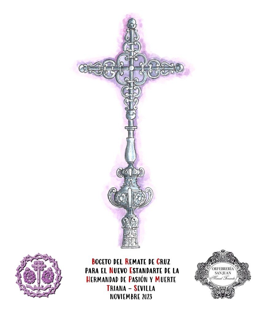 La Hermandad de Pasión y Muerte ha presentado el boceto del remate de su nuevo estandarte corporativo, el cual será realizado por Orfebrería San Juan. El nuevo diseño es obra de Víctor Manuel Castro Sánchez, mientras que la cruz imita la cruz que corona la capilla del Carmen del Puente.