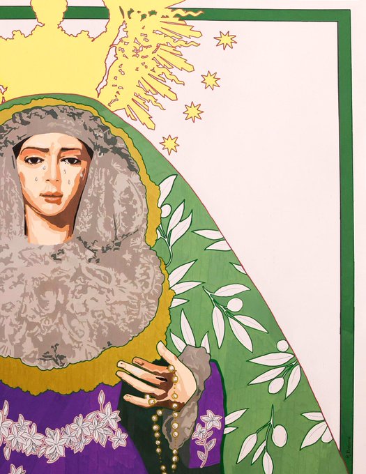 El joven artista malagueño ha sabido plasmar la belleza de la dolorosa en un acrílico sobre tabla montada en bastidor, portando un manto verde oliva. También se ven las hojas y frutos del olivo, silueteados en la prenda. Parecen hebreas de plata tejidas con esmero. El olivo hace alusión al misterio y representa la resistencia, la perdurabilidad y la fortaleza.