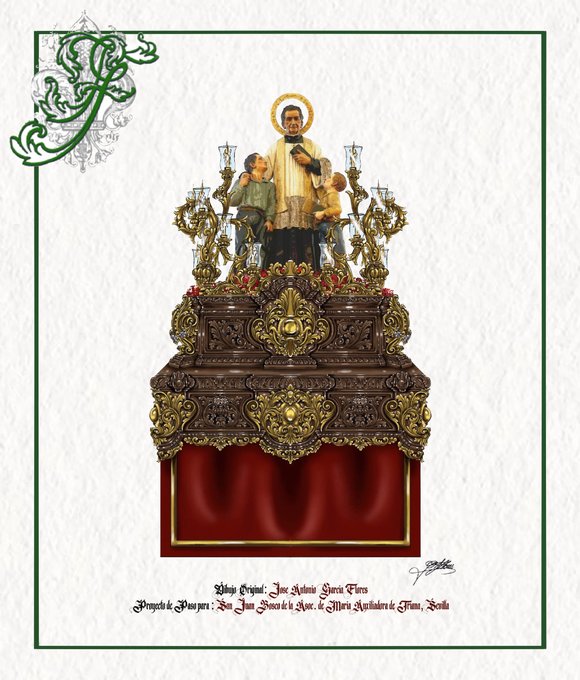 La Asociación de Fieles de María Auxiliadora de Triana ha presentado el boceto del nuevo paso procesional de San Juan Bosco. Se trata de un diseño, en estilo neoclásico con detalles barrocos del siglo XVII, de José Antonio García Flores. Los elementos se componen de hojarascas de acanto, motivos florales y frutas.