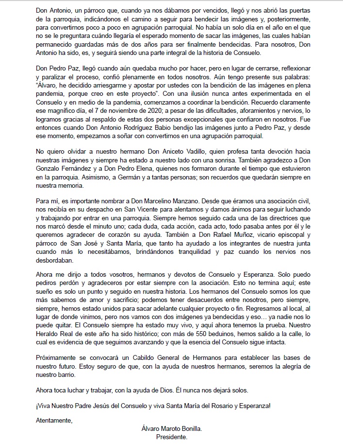 En la carta, Maroto, hace un repaso por la vida de la asociación desde 2017 cuando Antonio Rodríguez Babío les invita a unirse a la comunidad parroquial a quien considera que «es, y seguirá siendo una parte integral de la historia del Consuelo». También se hace mención de los miembros de la asociación presentes y partícipes en las diferentes pastorales de la parroquia como cáritas, pastoral de la familia, catequesis, pastoral de la salud o juventud. De Pedro Paz destaca que se arriesgó al apostar por ellos en plena pandemia cuando el 7 de noviembre de 2020 bendijo a las imágenes lo que les llevó a soñar con «convertirnos en una agrupación parroquial.»