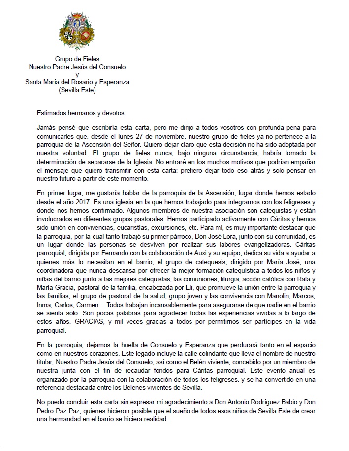En la carta, que no tiene desperdicio, anuncia que se convocará un cabildo general próximamente para iniciar un nuevo camino que les lleve a normalizar la vida del grupo de fieles dentro de una parroquia que los acoja y acompañe.