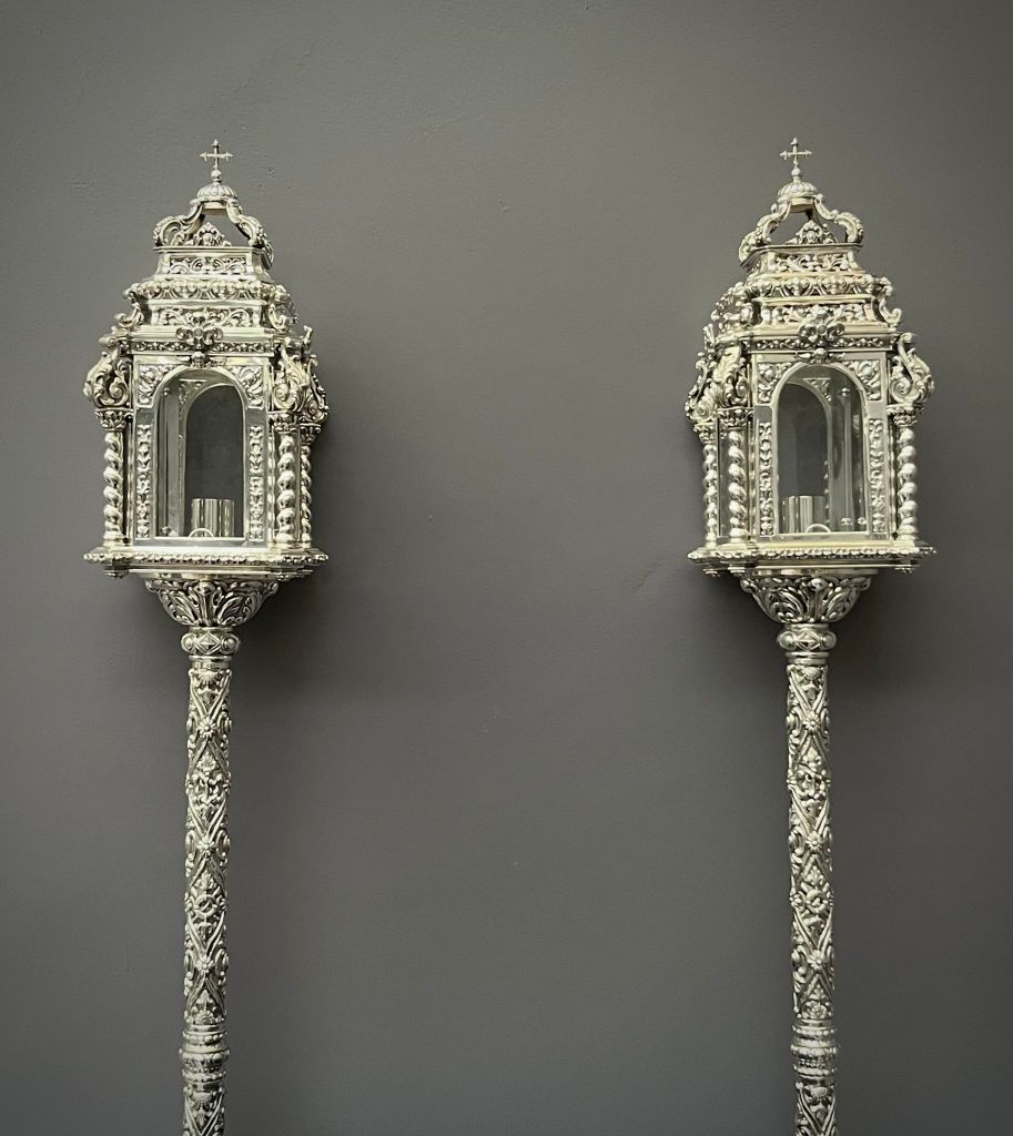 Se trata de una nueva pareja de candelabros y faroles realizados en plata de ley para las andas de traslado del orfebre Ramón León