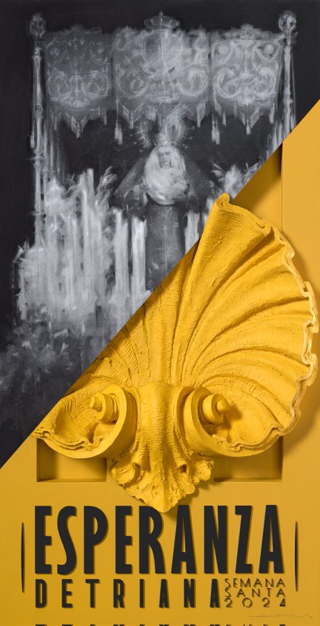 Se retrata a la Esperanza una vez acabada la estación de penitencia. En la zona inferior se aprecia el color albero, fiel a la técnica del autor, así como una venera de gran tamaño con el rótulo «Esperanza de Triana, Semana Santa 2024». La concha es símbolo de feminidad y fertilidad, elemento marinero y representación de ‘El Nacimiento de Venus’. La Esperanza es icono devocional del barrio de Triana.