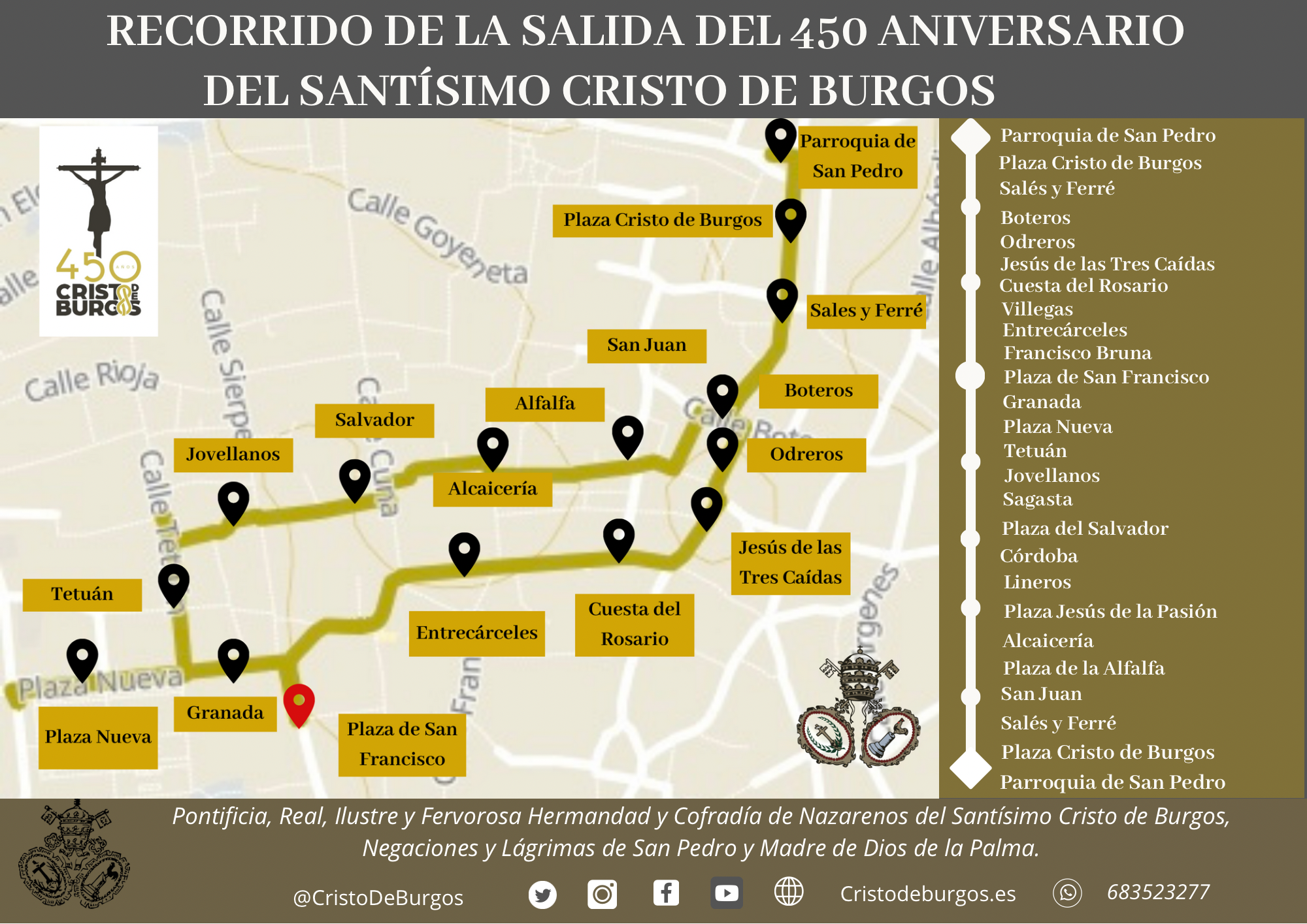 Las puertas de la Iglesia de San Pedro se abrirán a las 7.25h para comenzar la salida extraordinaria con el siguiente itinerario: plaza del Cristo de Burgos, Sales y Ferré, Boteros, Odreros, Jesús de las Tres Caídas, Cuesta del Rosario, Entrecárceles con llegada a la Plaza de San Francisco a las 8.45h.
