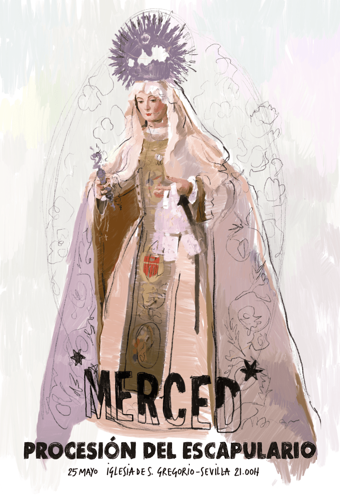 El anuncio está presidido por Nuestra Madre y Señora de la Merced. La intención de la artista ha sido plasmar el movimiento de la Virgen y el vaivén del escapulario.