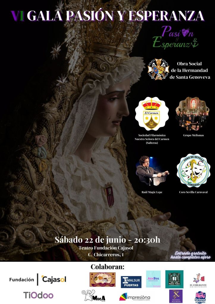 Este sábado 22 de junio a las 20:30h, la Sevilla Cofrade tiene una cita con la sexta edición de la Gala Benéfica ‘Pasión y Esperanza’, a celebrar en el Teatro Chicarreros de la Fundación Cajasol. Será a favor de la Obra Social de la Hermandad de Santa Genoveva, que asiste a tantas familias del barrio.