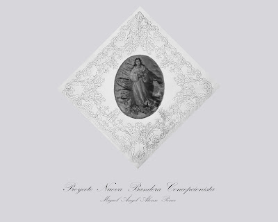 «El diseño del proyecto para la nueva bandera concepcionista contempla un fondo en el que se entrelazan hojas de acanto entrantes y salientes hasta unificarse entre sí. Esta ornamentación incluye carretes que entre ellos se conectan y forman el enmarcado de la propia bandera, lo que implica que esta no termine en recto sino en el propio movimiento en entrantes y salientes como las hojas de acanto indicadas anteriormente. Las esquinas de la Bandera se rematan en cartelas cuyo contenido está motivado por Letanías de la Virgen, cabiendo destacar la principal donde se puede ver la azucena, símbolo de pureza. La cartela inferior remata en punta con la rosa, simbolizando la letanía de la Rosa Mística. Finalmente, en la parte central podemos ver la pintura de la Inmaculada Concepción de la actual Bandera, que es obra de Luis Rizo.»