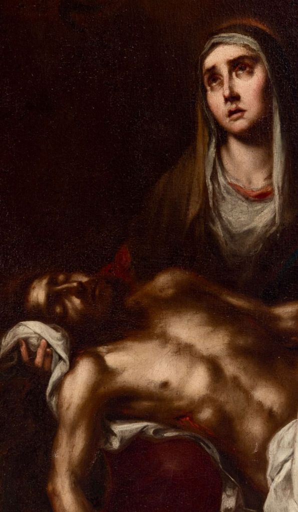 Compositivamente también es fiel al original: el cuerpo muerto de Cristo es acogido por la Virgen, a la que acompañan dos ángeles. Uno de ellos se enjuga las lágrimas. Tres serafines asoman en el rompimiento de Gloria. Intensos claroscuros modelan los cuerpos y subrayan el pathos de la escena. Los instrumentos de la Pasión descansan junto al cuerpo exánime.