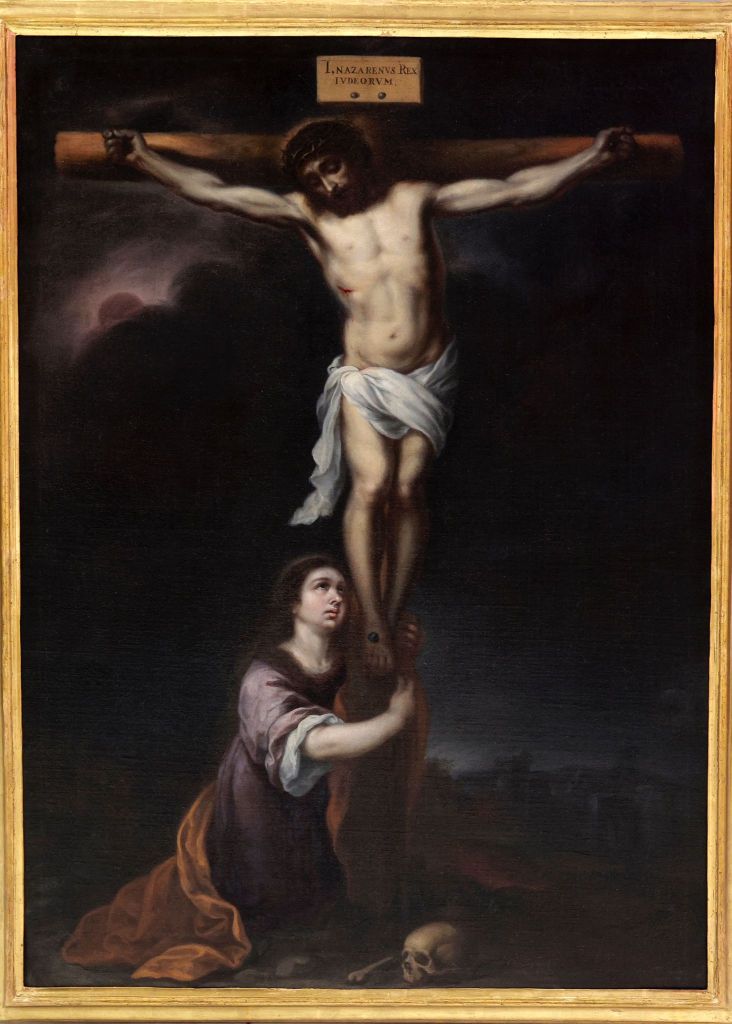 Al fondo, la ciudad de Jerusalén se dibuja bajo la tenue luz de una luna eclipsada, simbolizando el oscurecimiento cósmico que acompaña la muerte de Jesús. La pincelada, amplia pero delicada, moldea gestos y figuras con precisión, transmitiendo la atmósfera mística de la escena bíblica.