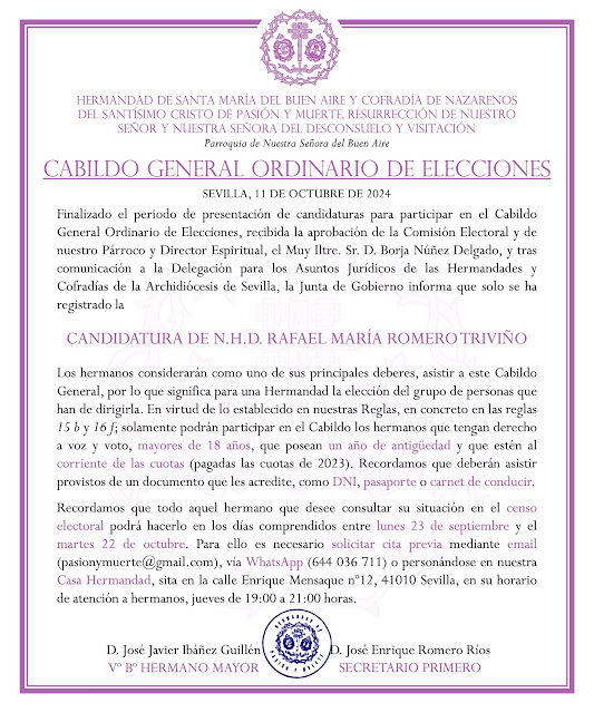 La Hermandad de Pasión y Muerte ha anunciado mediante sus redes sociales la convocatoria del Cabildo General Ordinario de Elecciones, previsto para las próximas semanas, en un comunicado emitido el 11 de octubre de 2024. Según la información compartida, el proceso de presentación de candidaturas ha concluido, resultando en la aceptación de una única candidatura por parte de la Comisión Electoral y el Párroco y Director Espiritual de la Hermandad, el Muy Ilustre Sr. D. Borja Núñez Delgado. Esta candidatura corresponde al hermano N.H.D. Rafael María Romero Triviño.