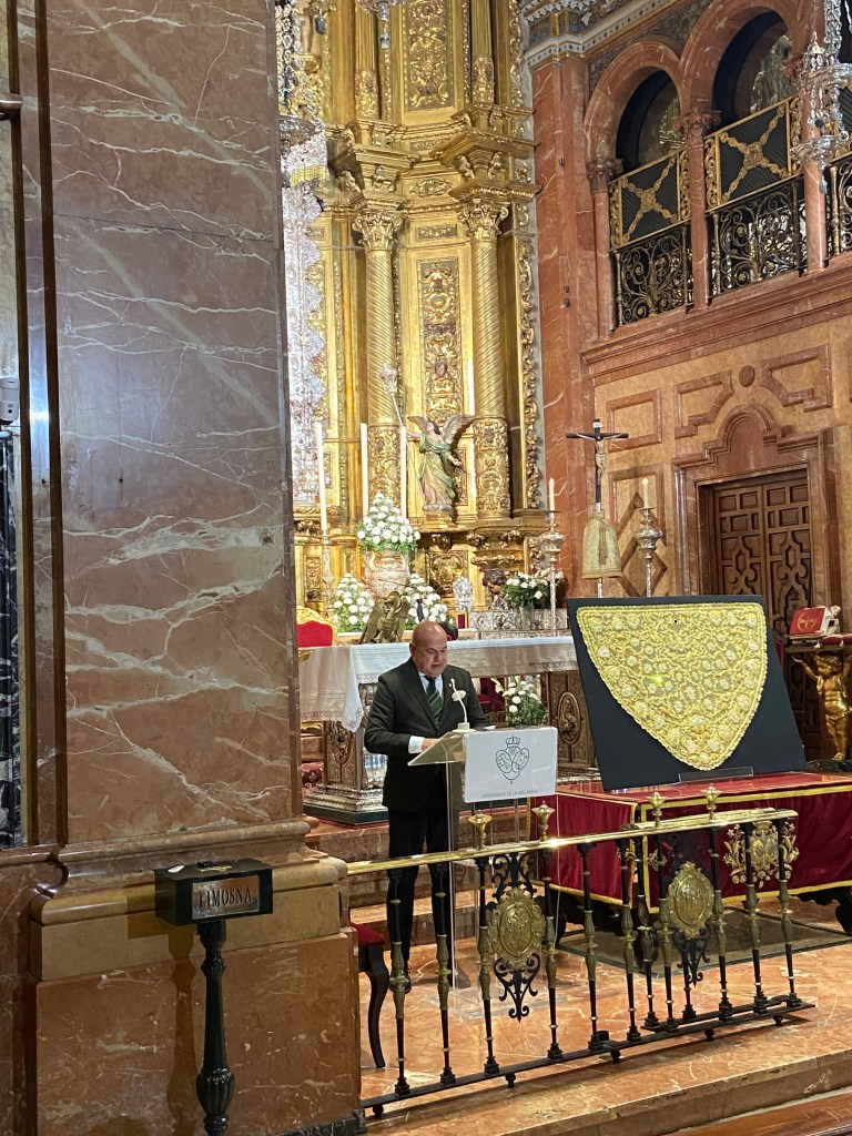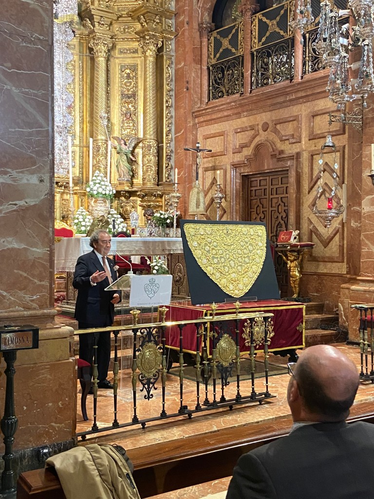 Durante la intervención del Hermano Mayor, José Antonio Fernández Cabrero, ha comentado como se enamoró de la Virgen de la Esperanza Macarena y la colaboración de Juanita Reina en ello. El cántabro ha hablado de lo que representa su tierra, la Virgen y la artista que le regaló la toca a la dolorosa para él. Finalmente se ha procedido a la realización de las fotografías oficiales y corporativas junto a la nueva pieza.