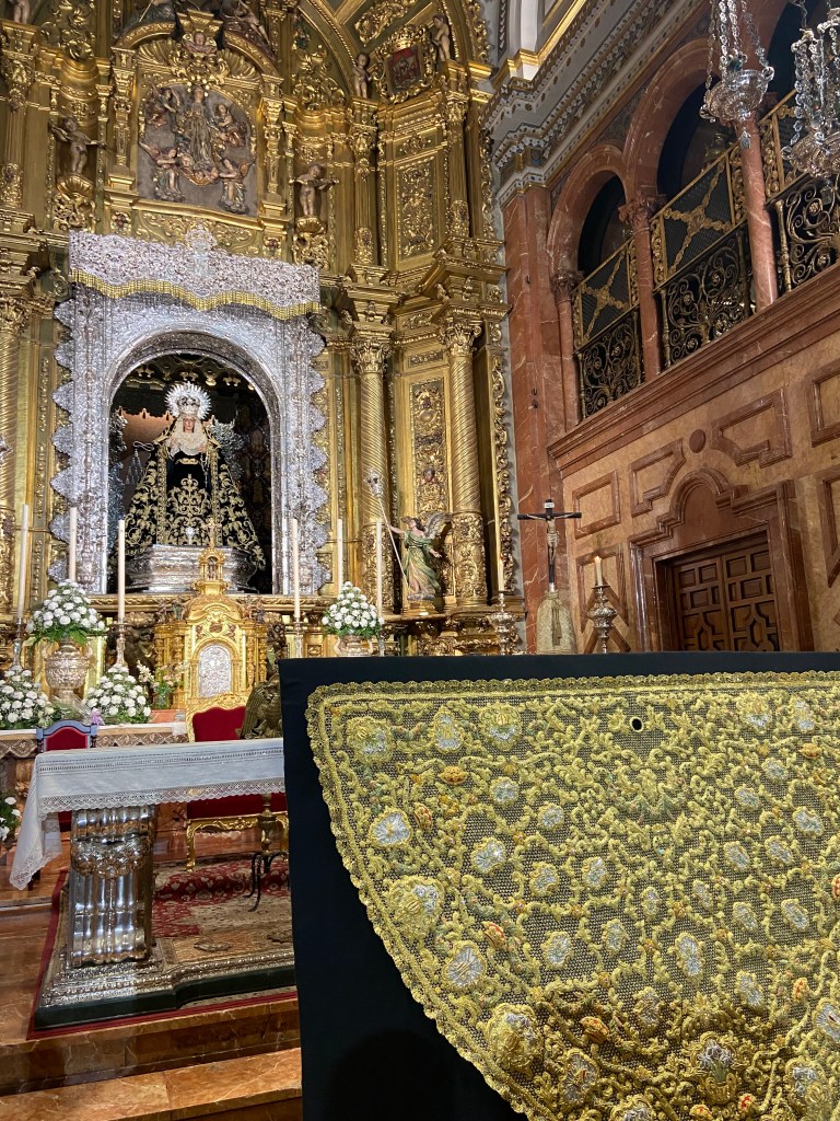 ‘Paquili’ y su taller han realizado esta recreación fiel de la toca de sobremanto que regalase en su tiempo la artista. Ha comentado que se ha tratado de un proceso muy complicado debido a la escasez de los materiales originales con los que se realizó el regalo a la Esperanza. Los materiales que se han empleado ha sido difíciles de encontrar y han requerido de mucha dedicación para la realización de la obra. Sin duda, se trata de una pieza preciosa realizada por este taller, que ya ha restaurado otras dos de la misma Hermandad.