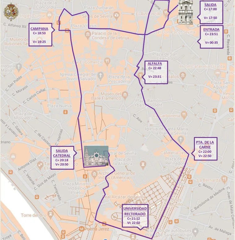 La corporación del Jueves Santo saldrá de su sede temporal sobre las 17:00 horas, llegando a la Plaza de la Campana alrededor de las 19:00 horas. Tras realizar la Carrera Oficial saldrían de la Santa Iglesia Catedral alrededor de las 20:15 – 20:20 horas. La Hermandad ha fijado tres puntos en el recorrido de vuelta: el Rectorado de la Universidad de Sevilla, la Puerta de la Carne y la Alfalfa.