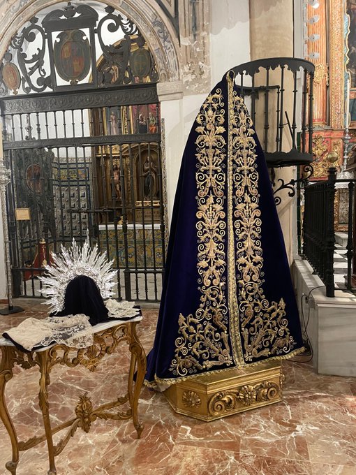 El manto ha sido realizado por el taller de bordados de la Hermandad, dirigido por Enrique Bendala. Se ha realizado en terciopelo morado aprovechando piezas de bordado realizadas por Esperanza Elena Caro procedentes de la crestería del palio y que no se utilizaron durante el proceso de restauración y enriquecimiento de 2010.