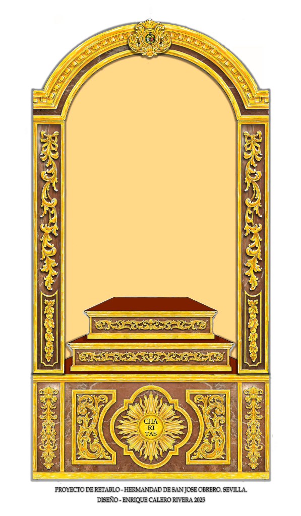 En este caso se trata de un nuevo retablo para Nuestro Padre Jesús de la Caridad. El pasado sábado durante el Cabildo de Cuentas y Presupuestos, la Junta de Gobierno dio a conocer el proyecto de un nuevo retablo de estilo neobarroco. El diseño ha sido realizado por Enrique Calero Rivera y será ejecutado en su taller. El altar se realizará completamente en madera con diferentes decoraciones talladas imitando al mármol y los moldurajes y ornamentaciones en pan de oro metal.