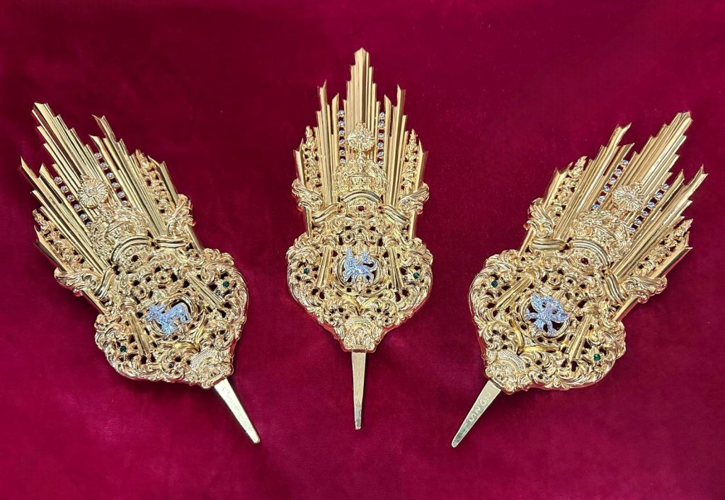 Por su parte, el nuevo puñal para María Santísima del Rosario ha sido realizado por la Joyería El Toisón, siguiendo la línea de diseño de otras piezas creadas para la Virgen. Está elaborado en plata de ley chapada en oro y destaca por su decoración barroca, en la que sobresale el Anagrama de María con corona real, símbolo de su realeza. La hoja, finamente calada, está enriquecida con detalles en oro rosa, coral, perlas cultivadas y circonitas, ofreciendo un acabado elegante y solemne. Esta joya ha sido donada por una familia anónima de la hermandad, como muestra de devoción y amor hacia la Virgen.