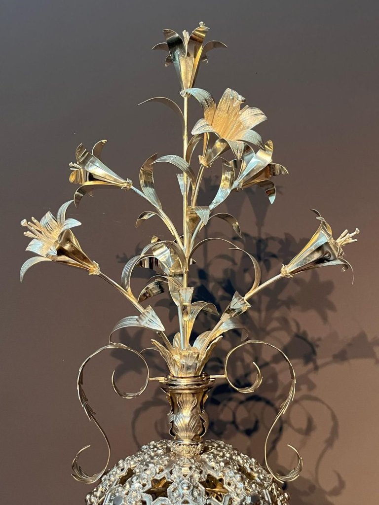 La pieza ha sido realizada por el prestigioso taller de orfebrería de Ramón León, que han dado forma a esta obra de arte. Con este estreno, la Hermandad de las Aguas sigue apostando por la excelencia y el enriquecimiento de su patrimonio, asegurando que su paso de palio continúe siendo una de las grandes joyas de la Semana Santa de Sevilla.