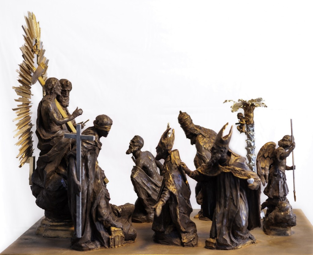 La composición se abre con la imagen de San Miguel Arcángel venciendo al pecado, imágenes que se conservarán del misterio actual, pero incorporando junto a ellas un elemento simbólico de gran significado: la Palmera y el Amor Divino, representada en madera tallada y dorada o bien en metal, y elevada sobre una nube. La Iglesia dormida y la Fe forman un conjunto escultórico con el propósito de enfatizar el mensaje de que la Fe es el pilar que sostiene a la Iglesia. En cuanto a los Padres de la Iglesia, se ha optado por representarlos con mayor claridad iconográfica: San Jerónimo aparecerá con el torso desnudo, sosteniendo el pergamino de la Biblia en alusión a su labor de traducción. San Ambrosio y San Agustín formarán un grupo en el que se plasmará su vínculo doctrinal, con San Agustín tocando la espalda de San Ambrosio, mientras este extiende los brazos en forma de cruz. Por su parte, San Gregorio, el único Papa entre los cuatro Padres de la Iglesia, será representado en actitud semigenuflexa, como gesto de reverencia ante la Santísima Trinidad. Para finalizar la obra, se culminará la orfebrería.