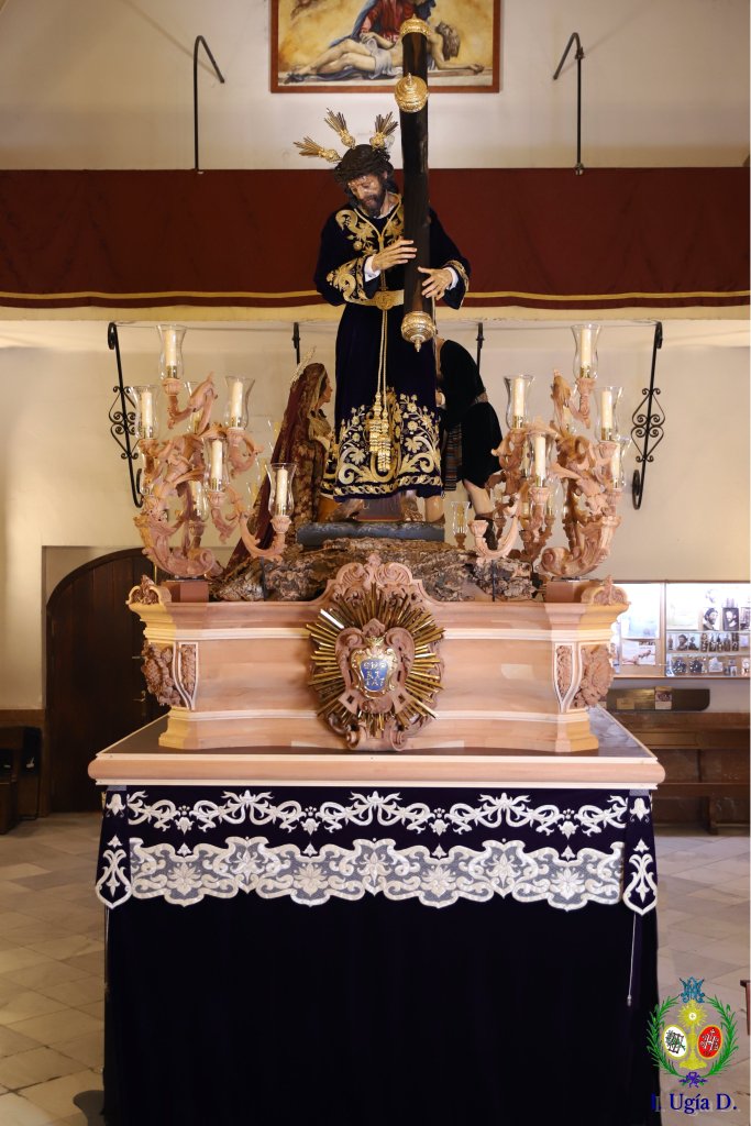 El paso se presenta con la primera fase del tallado y cuatro de los seis candelabros, todo realizado por Francisco Verdugo. La cartela central incorpora piezas de orfebrería firmadas por el taller Orfebrería Andaluza-Hermanos de los Ríos.