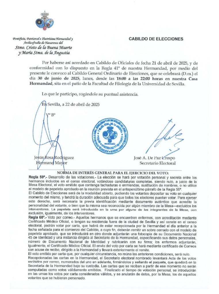Además, teniendo en cuenta el acuerdo adoptado en Cabildo de Oficiales con fecha 21 de abril de 2025, la Hermandad ha convocado la celebración del Cabildo General Ordinario de Cuentas. La sesión tendrá lugar el próximo 23 de junio de 2025, conforme a lo establecido en sus normas internas.