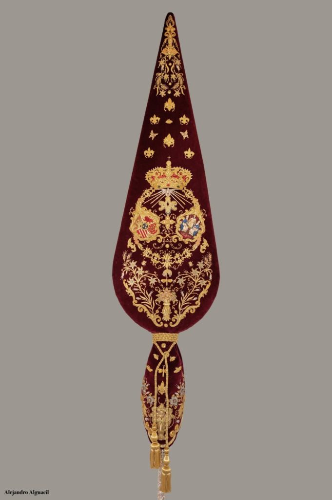 En el centro del estandarte destacan dos óvalos bordados con técnica exquisita, en los que figuran el escudo real y el de la ciudad de Sevilla, enmarcados por la corona y el toisón real. La riqueza cromática se hace patente en el uso de más de treinta tonalidades de hilos de seda, que junto al dorado otorgan a la obra un carácter solemne, institucional y profundamente identitario. Esta nueva insignia está llamada a convertirse en un símbolo de pertenencia y orgullo para todos los hermanos de Sevilla Sur.