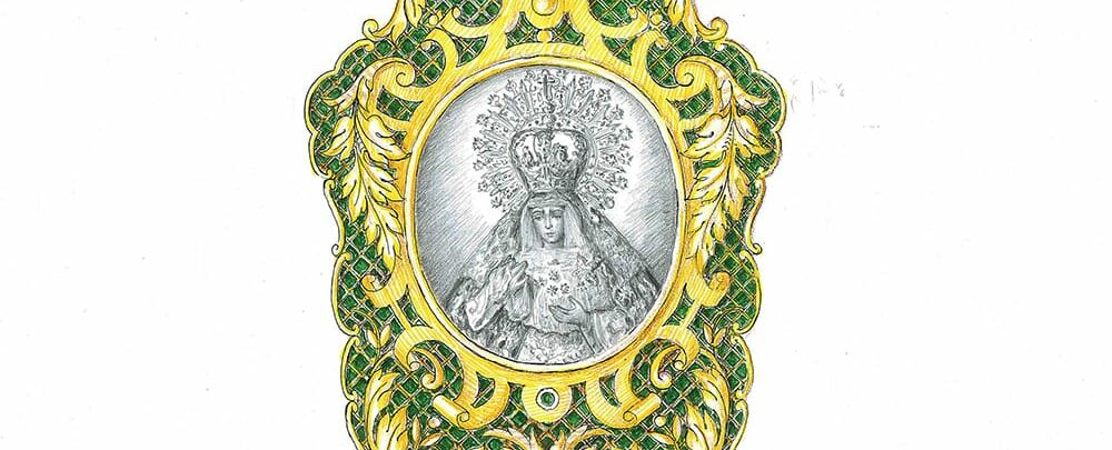 La cartela superior de la insignia incluirá una pintura de la Santísima Virgen de la Esperanza, que será realizada por la reconocida artista sevillana Nuria Barrera, aportando así una dimensión pictórica de gran valor devocional y estético. En el reverso, figurarán bordadas las inscripciones “Hermandad de la Esperanza Macarena” y “Madrina de la Bendición de Ntra. Sra. del Rosario”, reforzando el sentido conmemorativo de la pieza.