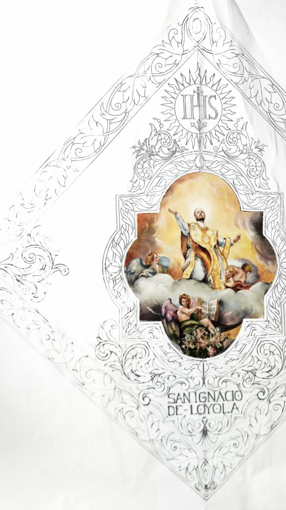 La insignia dedicada a San Ignacio de Loyola estará presidida por una destacada obra pictórica del artista sevillano Antonio Díaz Arnido, realizada originalmente en 2008 y conservada hasta ahora en el archivo de la corporación. La pintura, que ha sido enriquecida recientemente por el propio autor utilizando la técnica de óleo sobre lino belga, constituye el eje central de esta insignia, que se incorpora al cortejo procesional como símbolo de devoción al santo titular de la Hermandad.