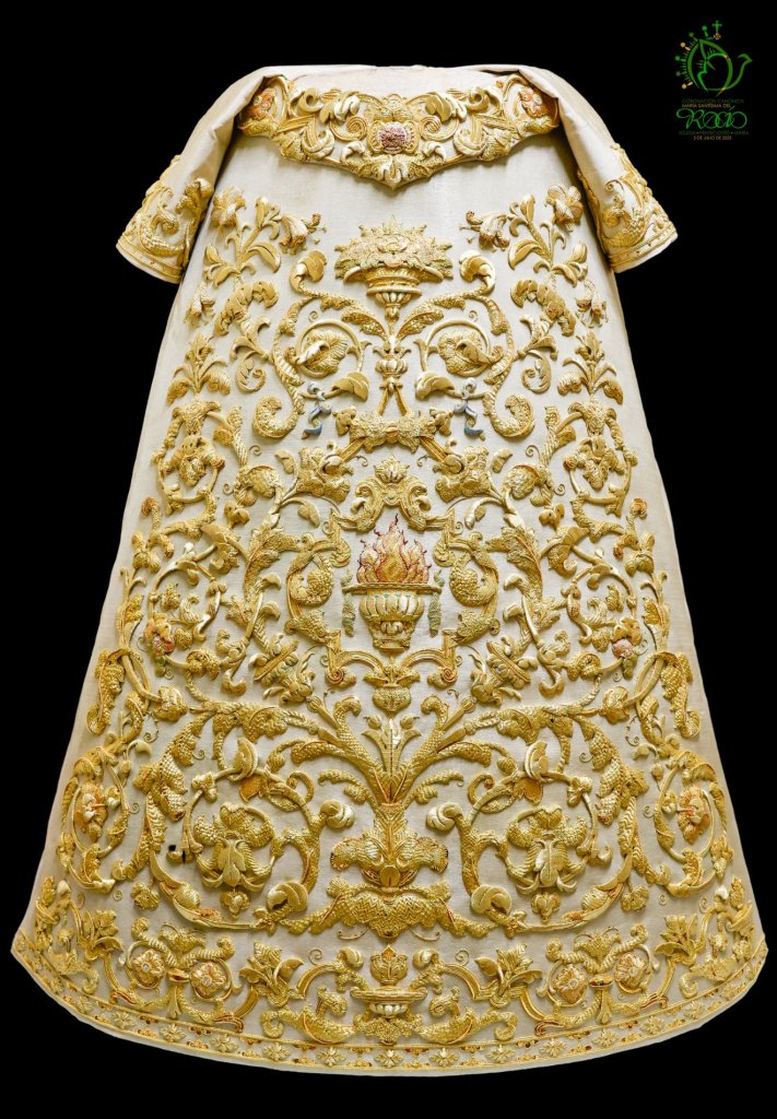 La Hermandad de la Redención ha presentado este lunes la saya de Coronación de María Santísima del Rocío. La portará el próximo 5 de julio. Diseño de Gonzalo Navarro, ha sido ejecutada en los talleres de Joaquín Salcedo.