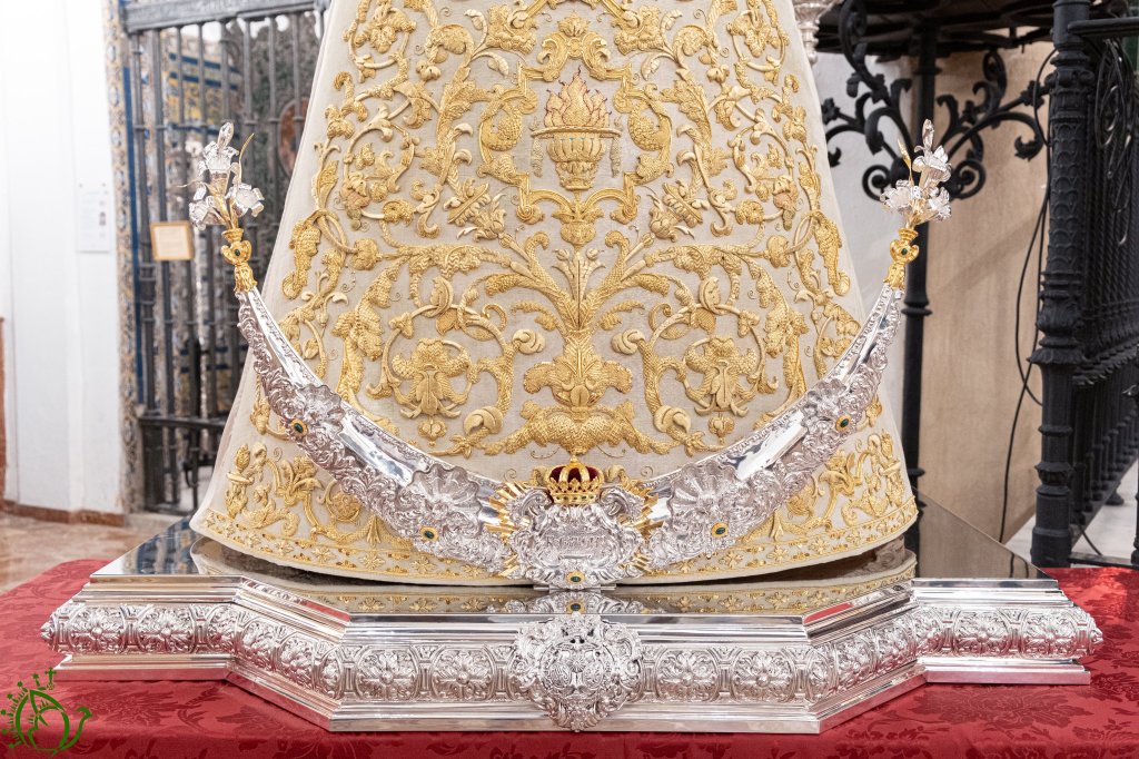 Una media luna de plata de ley diseño del artista Curro Claros y realizada por el orfebre cordobés Jesús de Julián, donada por el Grupo Joven y Grupo de Acólitos. Una peana de metal plateado realizada por el taller de Orfebrería Andaluza, regalo del Equipo de Priostía. Un encaje de Alençon de principios del S. XIX, donado por un grupo de hermanos. La medalla de Presidente de la Hermandad Matriz de Almonte, correspondiente al Comisario de la Coronación Canónica, Juan Ignacio Reales. Por último, diferentes joyas cada pieza donada por distintos hermanos.
