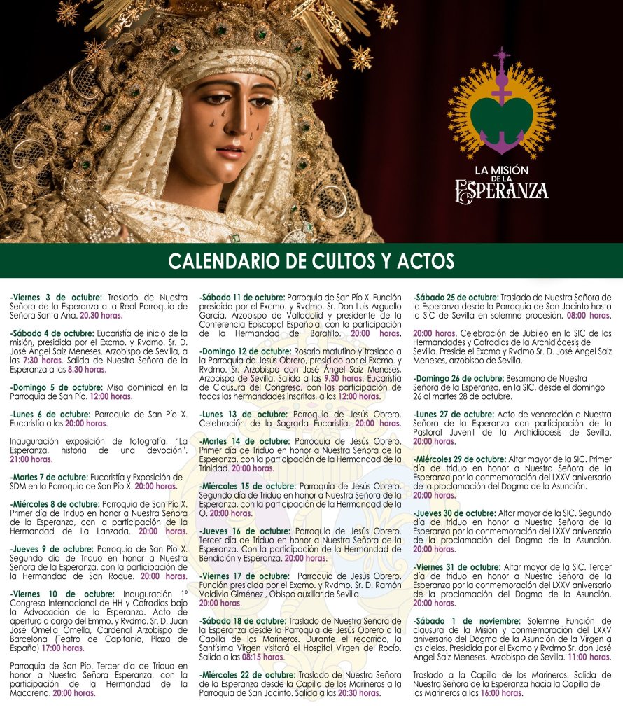 El lunes 27 de octubre será el acto de veneración a Nuestra Señora de la Esperanza, contando con la participación de la Pastoral Juvenil de la Archidiócesis de Sevilla, a las 20:00 horas.