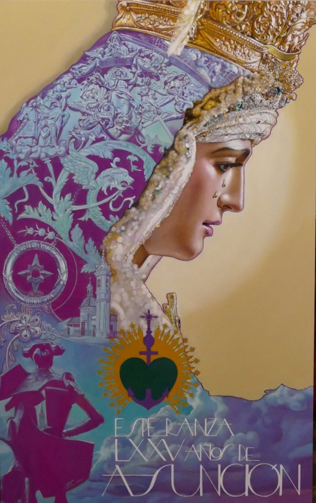 La composición se centra en el perfil majestuoso y sereno de Nuestra Señora de la Esperanza, que emerge sobre un fondo beige, simbolizando la pureza y la trascendencia mariana. La figura de la Virgen de Triana se convierte en el epicentro visual, integrando una rica iconografía que evoca tanto la identidad de su barrio como la conexión histórica y espiritual con Sevilla.