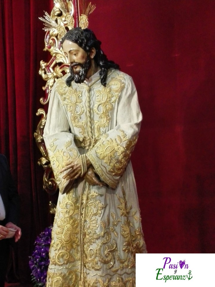 La túnica, célebre por su composición vegetal y su marcada simetría, fusiona influencias renacentistas con elementos del Art Nouveau, especialmente visibles en las sinuosas lazadas que articulan el conjunto. Su estética, reconocible y singular, la convierte en una de las piezas más admiradas del patrimonio textil cofrade.