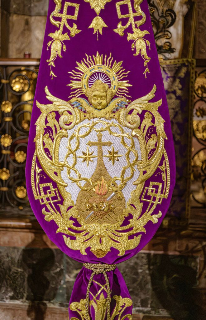 El uso de sedas de colores introduce matices y dinamismo en la obra, rompiendo la uniformidad del metal y enriqueciendo visualmente la pieza. Asimismo, la inclusión de un ángel bordado con notable volumen se convierte en uno de los elementos más llamativos, aportando carácter y reforzando el simbolismo del conjunto dentro del patrimonio de la hermandad.